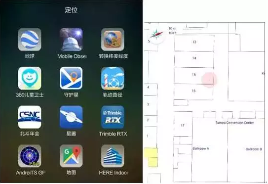 室内定位演示专项会议(A2a:PANEL:Indoor Location and Demonstrations),主要测试市内定位产品。下图是实际安装Nokia Here发布展厅的基于wifi的室内定位软件,该软件与2015年西安北斗导航年会上四维图展示的“北斗年会”室内定位应用相似。由此可见,室内定位技术已经走向实际应用,并达到了成熟期,室内定位应用领域将成为各大导航巨头角逐的一个主战场。